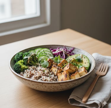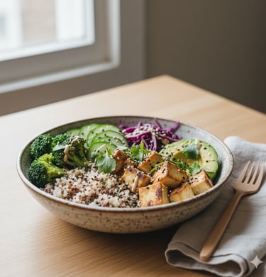Un bol complet au quinoa, tofu grillé et légumes colorés, riche en protéines.